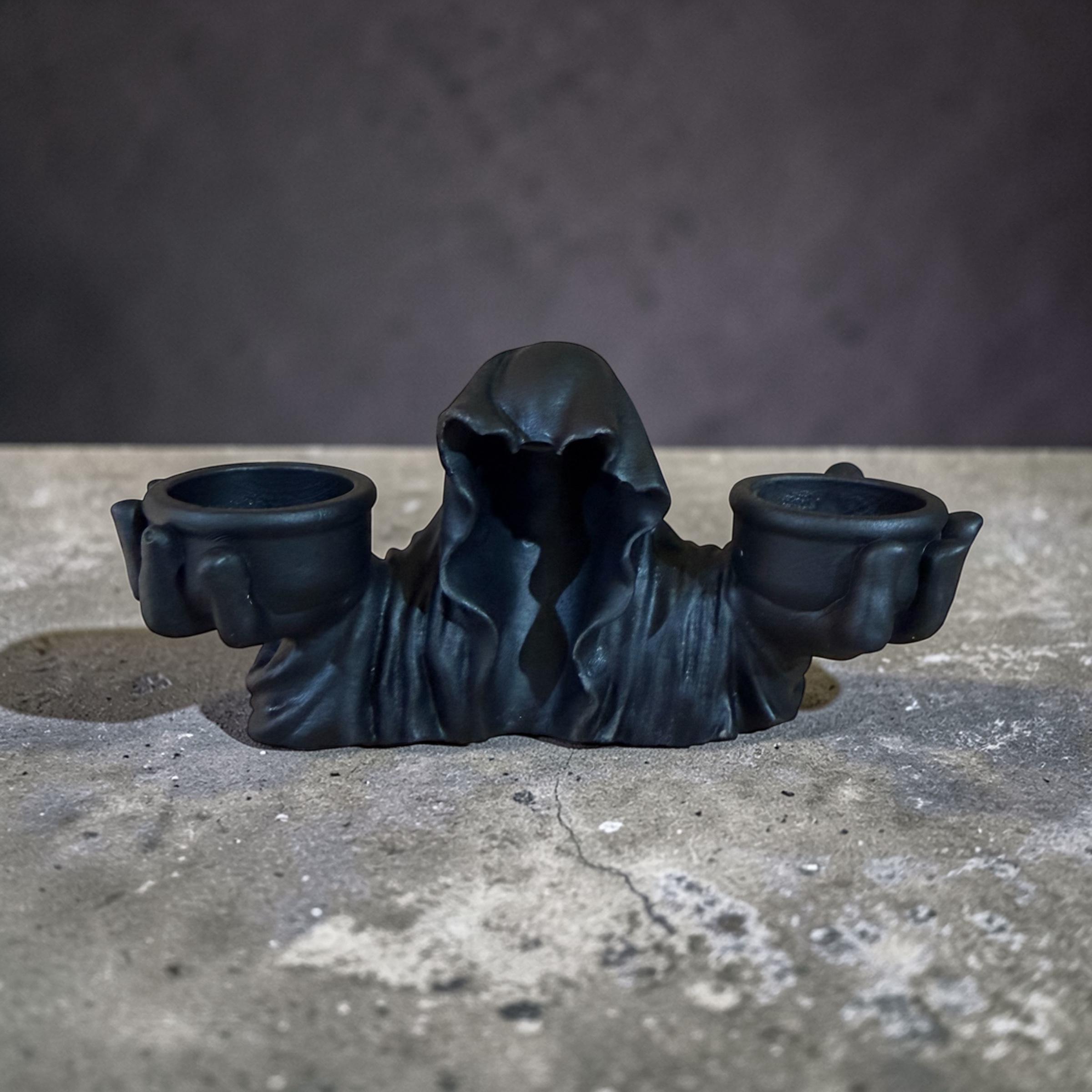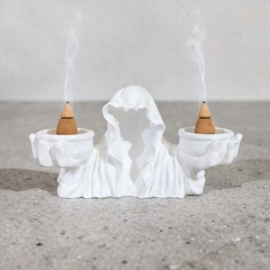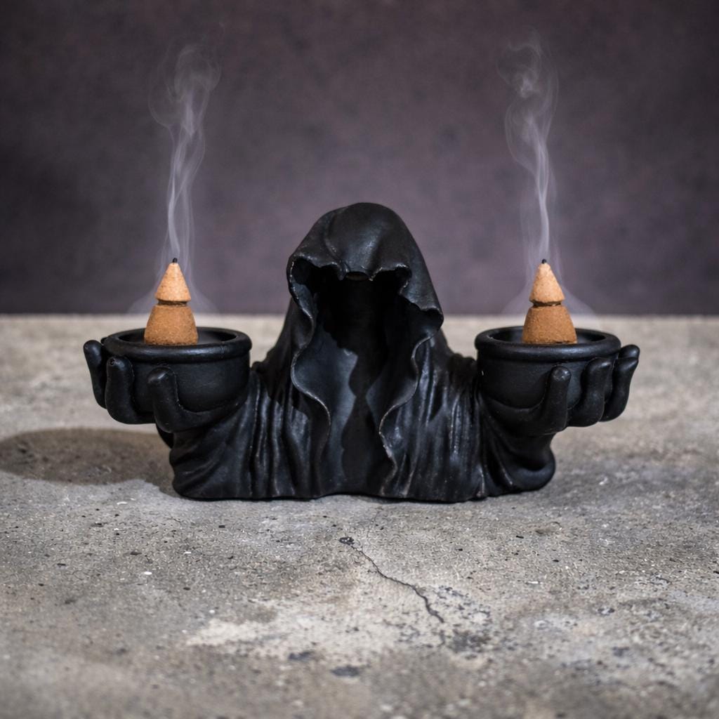 Hooded ghost incense burner with grim reaper details. Gothic smoke statue for Halloween décor, witchy altars and spooky room styling.