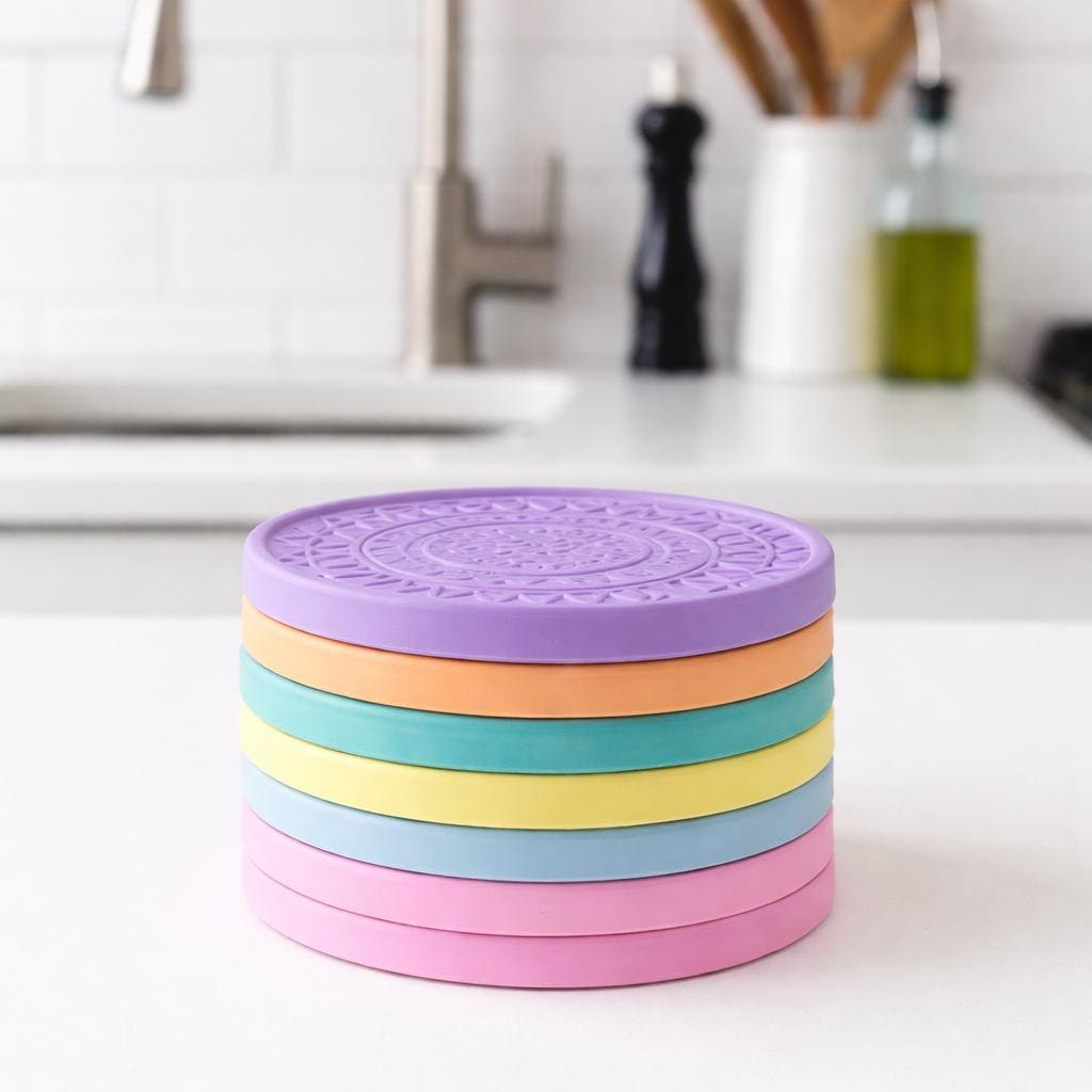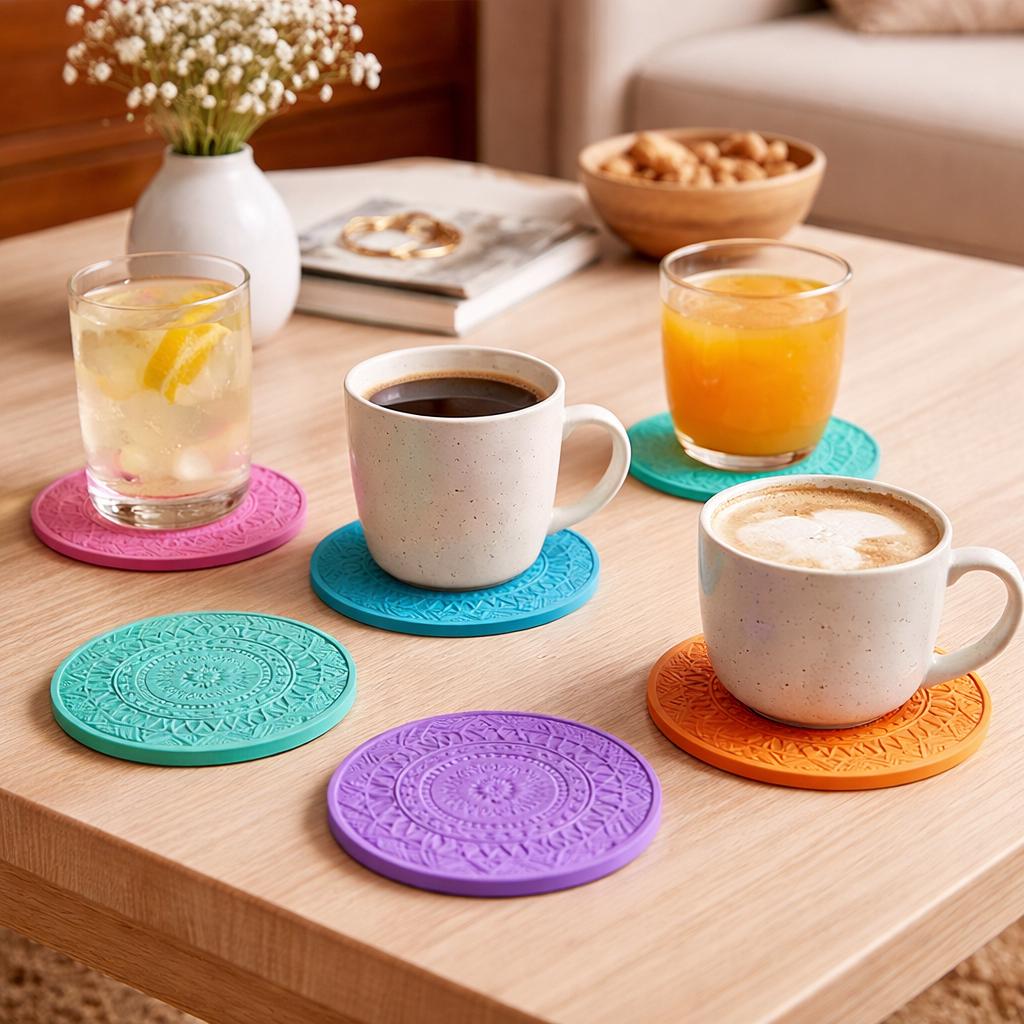 Handmade colorful embossed coasters made from durable stone powder, featuring vibrant geometric details for modern homes, coffee tables and cheerful everyday décor.