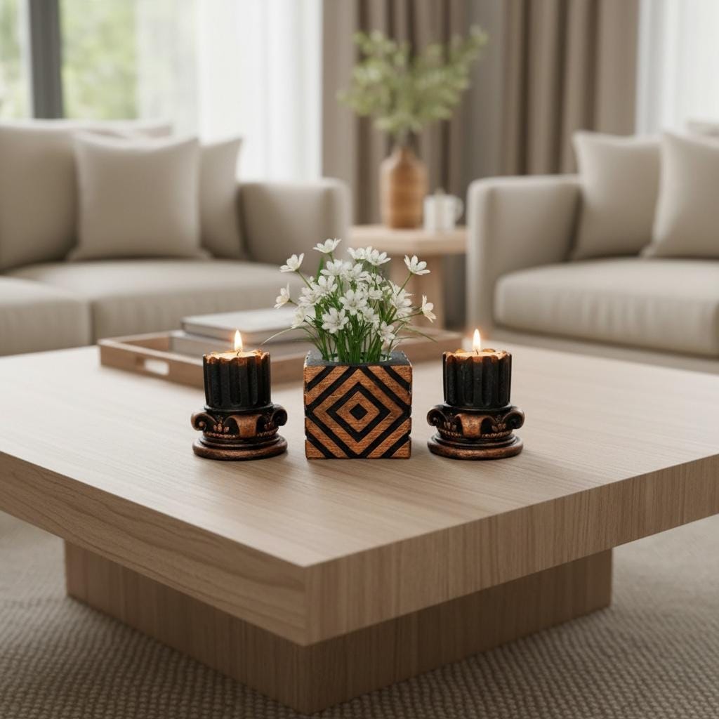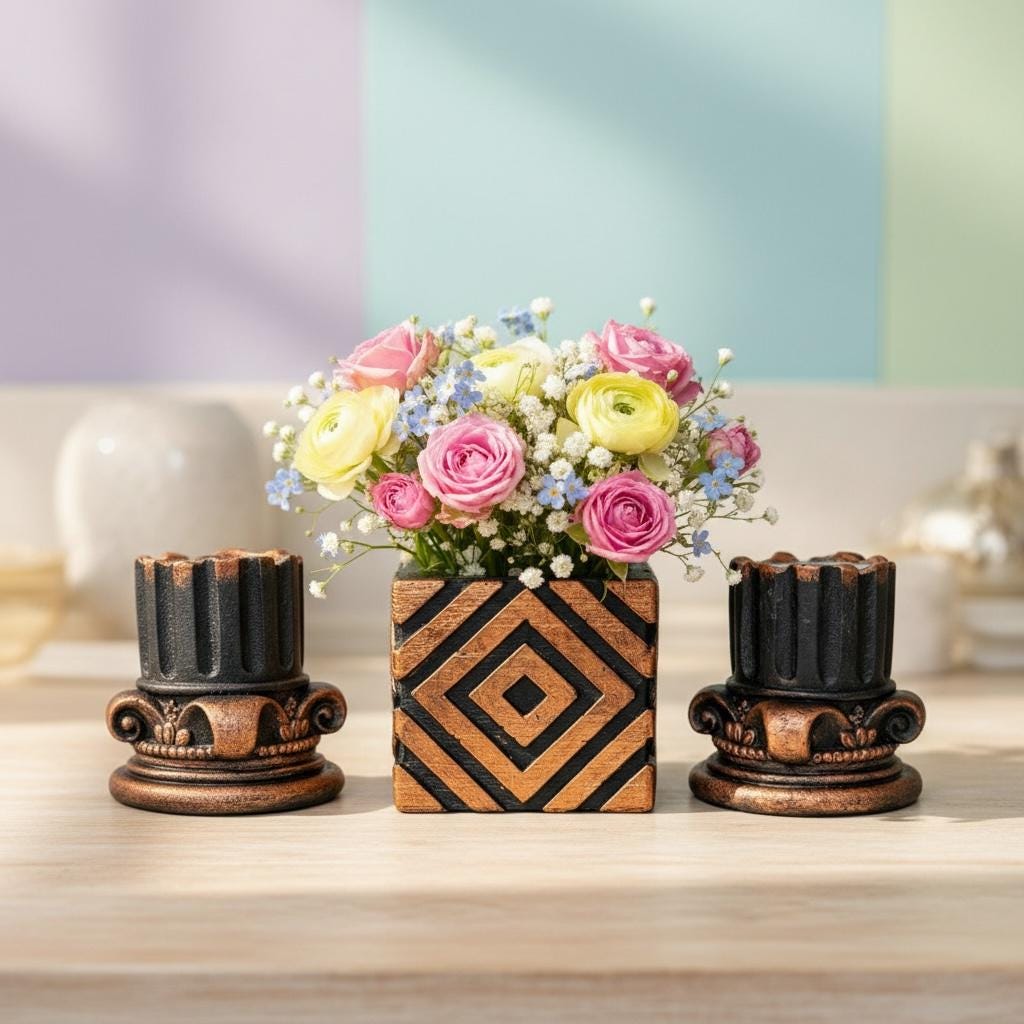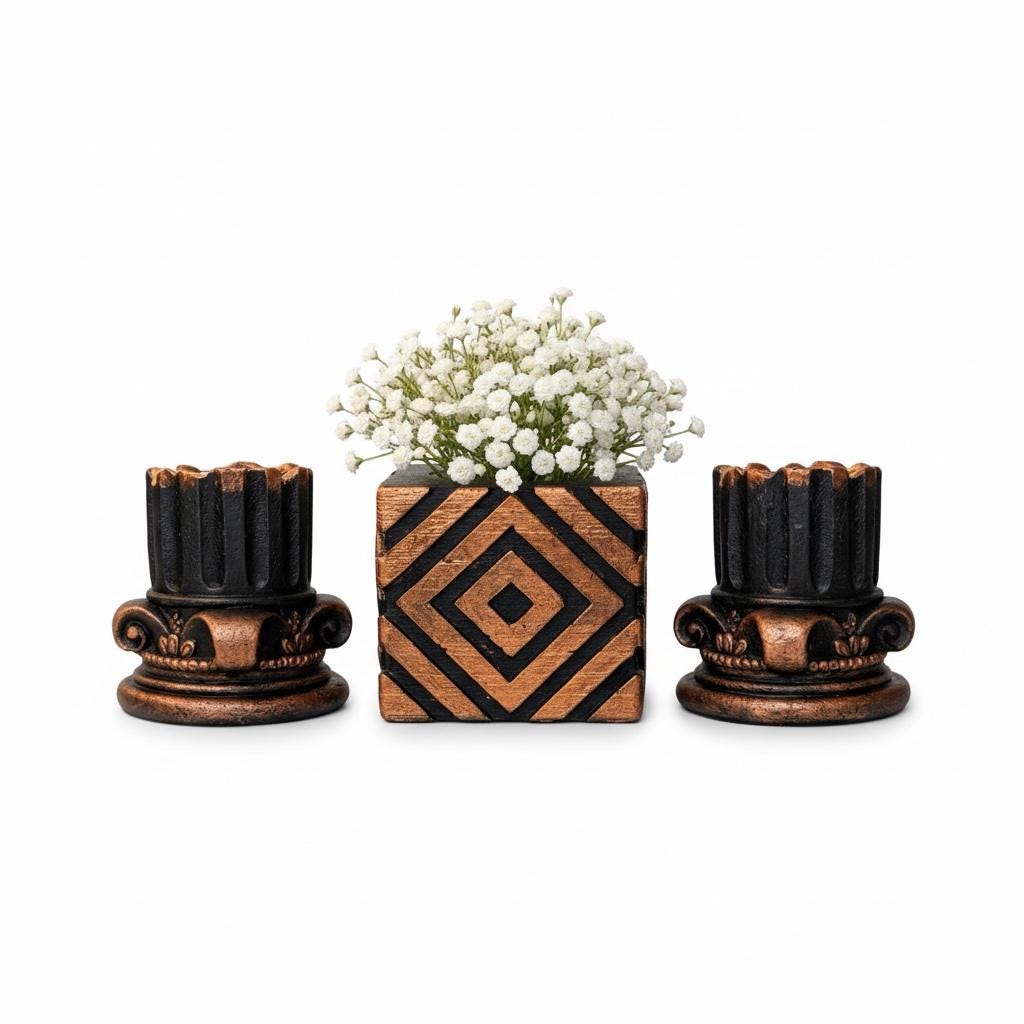 The set combines two Roman column–style candle holders with a geometric architectural cube centerpiece, creating a balanced and sculptural decor statement.