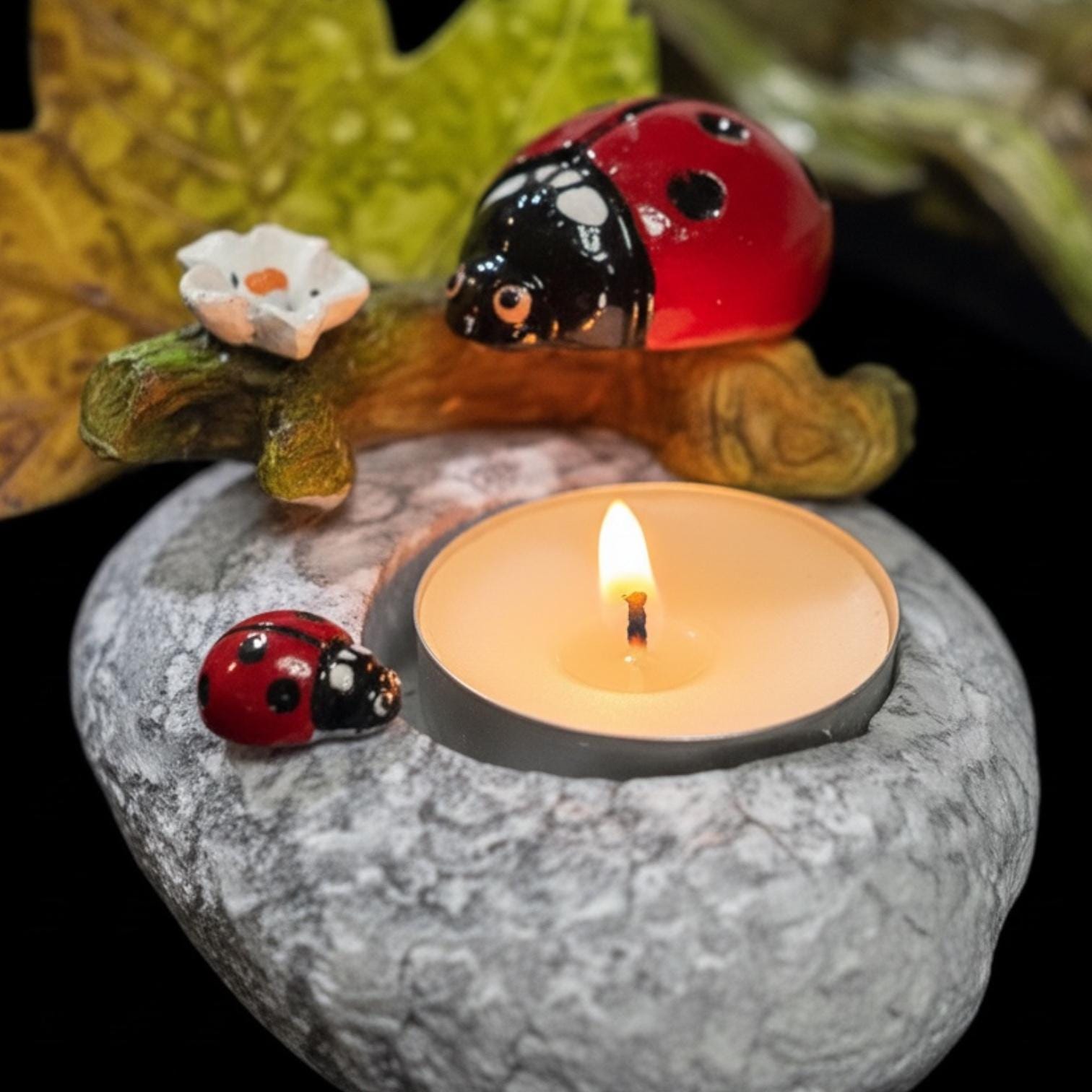 This handmade concrete candle and incense holder set features a charming ladybug and leaf-inspired woodland design, created for nature lovers and cozy interiors.